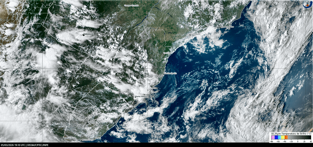 Imagem do satélite GOES 19/NOAA/EUA – True-Color + IR 10,35 µm – dia – 05/03/2026 – Hora local: 16:10 – Sul do Brasil. Fonte: Instituto Nacional de Pesquisas Espaciais (INPE)/Centro de Previsão de Tempo e Estudos Climáticos (CPTEC)/Divisão de Satélites e Sistemas Ambientais (DAS) modificado por LabClima/UNIVALI. Clique para ampliar.