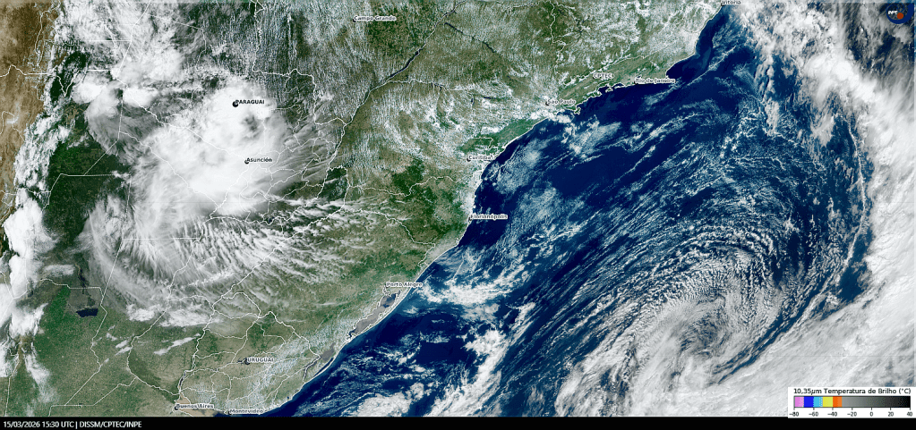 Imagem do satélite GOES-19/NOAA/EUA – True-Color + IR 10,35 µm – dia – 15/03/2026 – Hora local: 12:30 – Sul do Brasil. Fonte: Instituto Nacional de Pesquisas Espaciais (INPE)/Centro de Previsão de Tempo e Estudos Climáticos (CPTEC)/Divisão de Satélites e Sistemas Ambientais (DAS) modificado por LabClima/UNIVALI. Clique para ampliar.