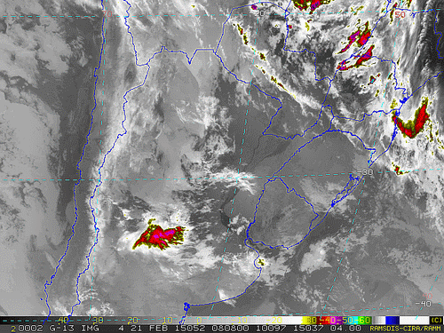 Imagem do satélite GOES 13/NOAA/EUA – Canal do Infravermelho + realce – dia 21/02/2015 – Hora local: 06:10 – Sul do Brasil.