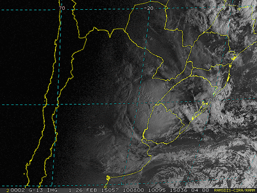 Imagem do satélite GOES 13/NOAA/EUA – Canal do Visível – dia 26/02/2015 – Hora local: 08:10 – Sul do Brasil.