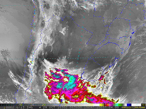 Imagem do satélite GOES 13/NOAA/EUA – Canal do Infravermelho + realce – dia 29/10/2015 – Hora local: 06:40 – Sul do Brasil.