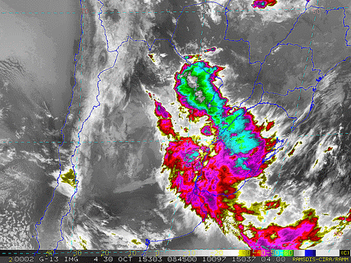 Imagem do satélite GOES 13/NOAA/EUA – Canal do Infravermelho + realce – dia 30/10/2015 – Hora local: 06:45– Sul do Brasil.