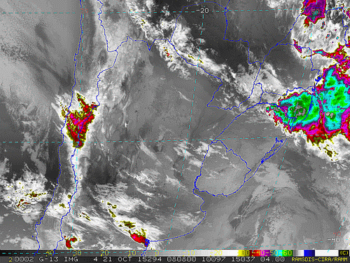 Imagem do satélite GOES 13/NOAA/EUA – Canal do Infravermelho + realce – dia 21/10/2015 – Hora local: 06:10 – Sul do Brasil.