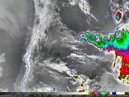 Imagem do satélite GOES 13/NOAA/EUA – Canal do Infravermelho + realce – dia 22/10/2015 – Hora local: 06:10 – Sul do Brasil.