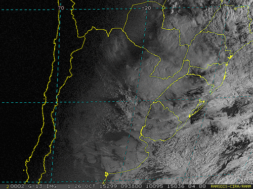 Imagem do satélite GOES 13/NOAA/EUA – Canal do Visível – dia 26/10/2015 – Hora local: 07:40 – Sul do Brasil.