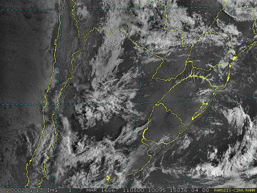 Imagem do satélite GOES 13/NOAA/EUA – Canal do Visível – dia 07/03/2016 – Hora local: 07:10 – Sul do Brasil.
