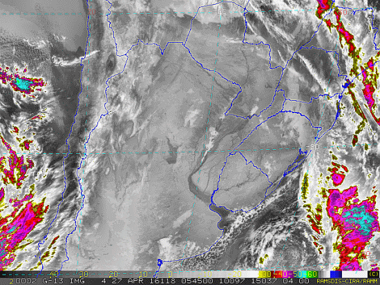 Imagem do satélite GOES 13/NOAA/EUA – Canal do Infravermelho + realce – dia 27/04/2016 – Hora local: 05:45 – Sul do Brasil. Fonte: RAMSDIS Online – Central and South America and the Caribbean, Cooperative Institute for Research in the Atmosphere, Colorado State University, EUA, modificado por LabClima/UNIVALI.