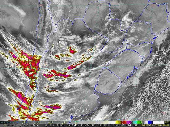A massa de ar seca e fria se fez e faz presente nessa madrugada e início de manhã, com temperaturas baixas no território catarinense. No oeste temperaturas entre 5/8°C, no planalto entre 1/4°C, no litoral entre 6/13°C. Em Bom Jardim da Serra às 5 horas a temperatura era de 2,7°C negativos. Aqui em nossa região, no mesmo horário, a temperatura era de 10°C em Itajaí e 9,8°C em Camboriú. Essa massa de ar aos poucos se afasta para o oceano e entre quinta e sexta-feira uma nova frente fria se desloca por nossa região, mas sobre o oceano.