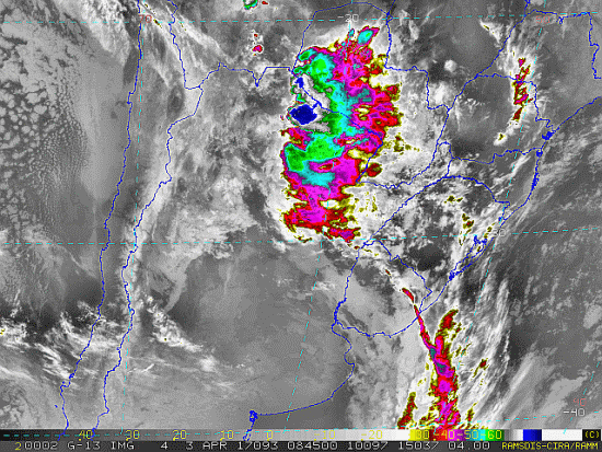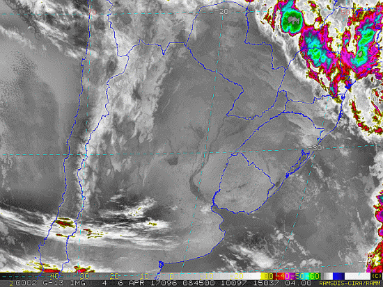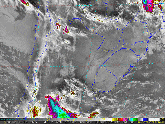 Uma nova frente fria se desloca em nossa direção a Santa Catarina e passará amanhã pela nossa região, depois uma massa de ar mais seca e fria atuará em parte da semana. Observe a imagem de satélite deste início de manhã muita nebulosidade no estado.