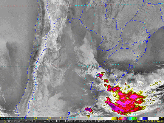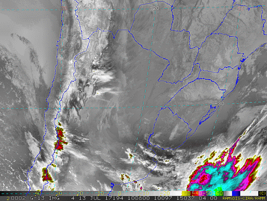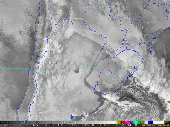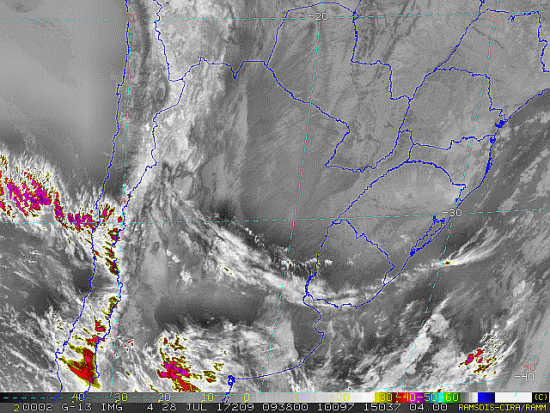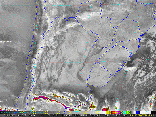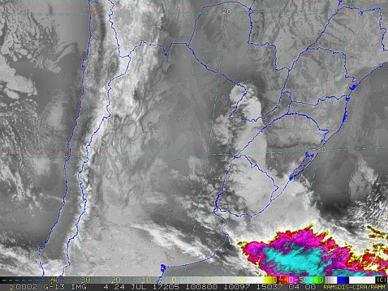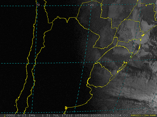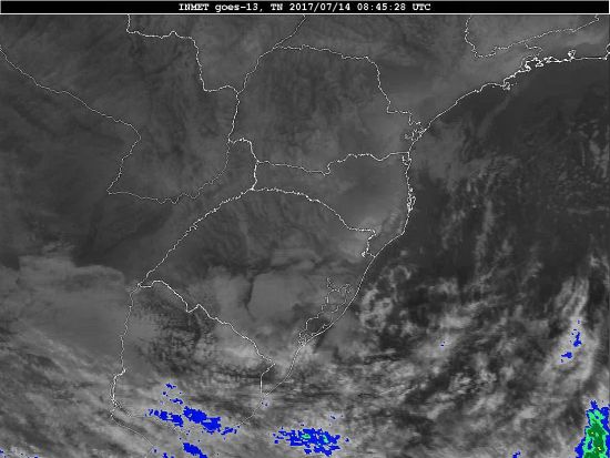 Observe a imagem de satélite desse início de manhã nebulosidade presente em Santa Catarina, como também entre o Uruguai e o Rio Grande do Sul devido a uma nova frente fria. Essa frente se intensificará e se moverá em direção ao Brasil passando por nossa região entre quarta e quinta-feira trazendo instabilidade.