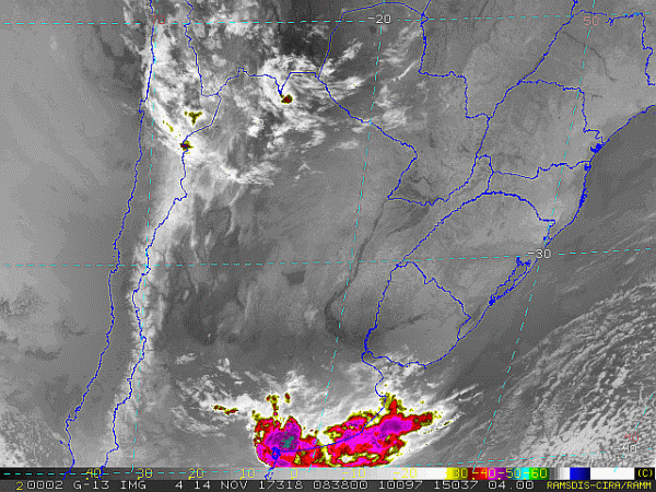 Imagem do satélite GOES 13/NOAA/EUA – Canal do Infravermelho + realce – dia 14/11/2017 – Hora local: 06:40 – Sul do Brasil. Fonte: RAMSDIS Online – Central and South America and the Caribbean, Cooperative Institute for Research in the Atmospere, Colorado State University, EUA, modificado por LabClima/UNIVALI.