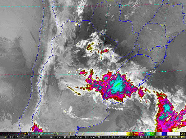 Imagem do satélite GOES 13/NOAA/EUA – Canal do Infravermelho + realce – dia 16/11/2017 – Hora local: 06:40 – Sul do Brasil. Fonte: RAMSDIS Online – Central and South America and the Caribbean, Cooperative Institute for Research in the Atmospere, Colorado State University, EUA, modificado por LabClima/UNIVALI.