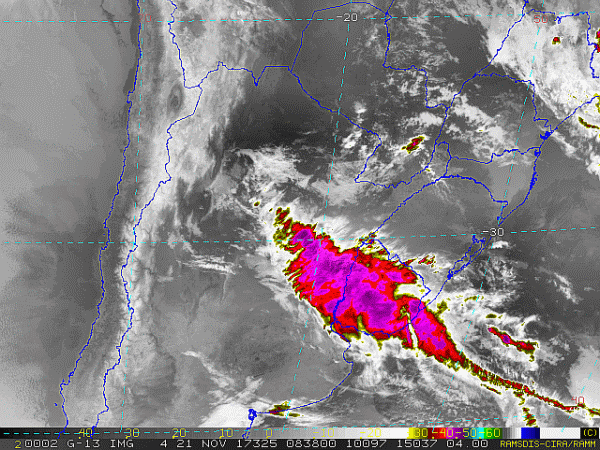 Imagem do satélite GOES 13/NOAA/EUA – Canal do Infravermelho + realce – dia 21/11/2017 – Hora local: 06:40 – Sul do Brasil. Fonte: RAMSDIS Online – Central and South America and the Caribbean, Cooperative Institute for Research in the Atmospere, Colorado State University, EUA, modificado por LabClima/UNIVALI.