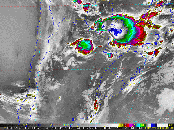 Imagem do satélite GOES 13/NOAA/EUA – Canal do Infravermelho + realce – dia 30/11/2017 – Hora local: 06:40 – Sul do Brasil. Fonte: RAMSDIS Online – Central and South America and the Caribbean, Cooperative Institute for Research in the Atmospere, Colorado State University, EUA, modificado por LabClima/UNIVALI.
