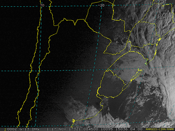 Imagem do satélite GOES 13/NOAA/EUA – Canal do Visível – dia 17/11/2017 – Hora local: 06:45 – Sul do Brasil. Fonte: RAMSDIS Online – Central and South America and the Caribbean, Cooperative Institute for Research in the Atmospere, Colorado State University, EUA, modificado por LabClima/UNIVALI.