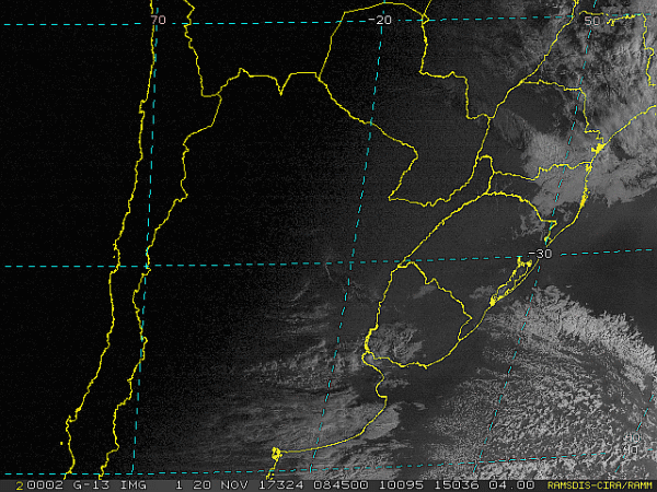 Imagem do satélite GOES 13/NOAA/EUA – Canal do Visível – dia 20/11/2017 – Hora local: 06:45 – Sul do Brasil. Fonte: RAMSDIS Online – Central and South America and the Caribbean, Cooperative Institute for Research in the Atmospere, Colorado State University, EUA, modificado por LabClima/UNIVALI.