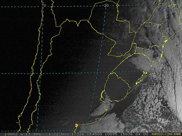 Imagem do satélite GOES 13/NOAA/EUA – Canal do Visível – dia 22/11/2017 – Hora local: 06:45 – Sul do Brasil. Fonte: RAMSDIS Online – Central and South America and the Caribbean, Cooperative Institute for Research in the Atmospere, Colorado State University, EUA, modificado por LabClima/UNIVALI.