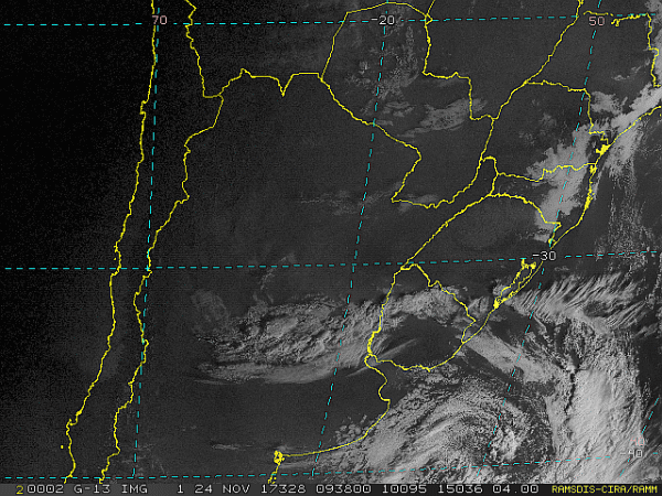 Imagem do satélite GOES 13/NOAA/EUA – Canal do Visível – dia 24/11/2017 – Hora local: 07:40 – Sul do Brasil. Fonte: RAMSDIS Online – Central and South America and the Caribbean, Cooperative Institute for Research in the Atmospere, Colorado State University, EUA, modificado por LabClima/UNIVALI.