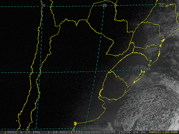 Imagem do satélite GOES 13/NOAA/EUA – Canal do Visível – dia 28/11/2017 – Hora local: 06:45 – Sul do Brasil. Fonte: RAMSDIS Online – Central and South America and the Caribbean, Cooperative Institute for Research in the Atmospere, Colorado State University, EUA, modificado por LabClima/UNIVALI.