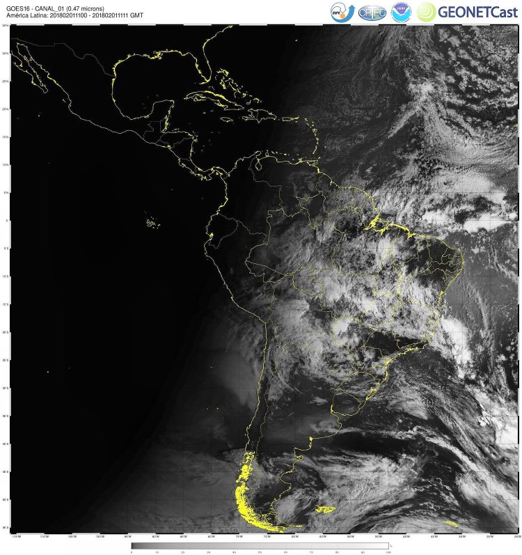 Imagem do satélite GOES 16/NOAA/EUA – Canal do visível (1) – dia 01/02/2018 – Hora local: 09:00 – América do Sul. Fonte: Instituto Nacional de Pesquisas Espaciais (INPE)/Centro de Previsão de Tempo e Estudos Climáticos (CPTEC)/Divisão de Satélites e Sistemas Ambientais (DSA)/GEONETCast modificado por LabClima/UNIVALI.