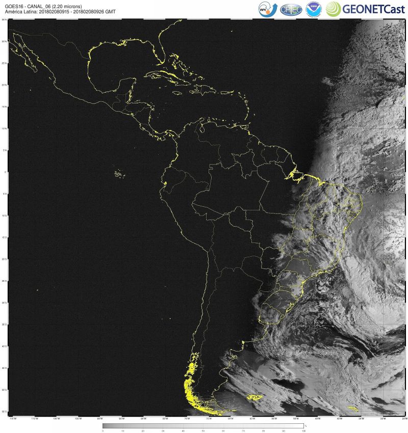 Imagem do satélite GOES 16/NOAA/EUA – Canal do Infravermelho (6) – dia 08/02/2018 – Hora local: 07:15 – América do Sul. Fonte: Instituto Nacional de Pesquisas Espaciais (INPE)/Centro de Previsão de Tempo e Estudos Climáticos (CPTEC)/Divisão de Satélites e Sistemas Ambientais (DSA)/GEONETCast modificado por LabClima/UNIVALI.