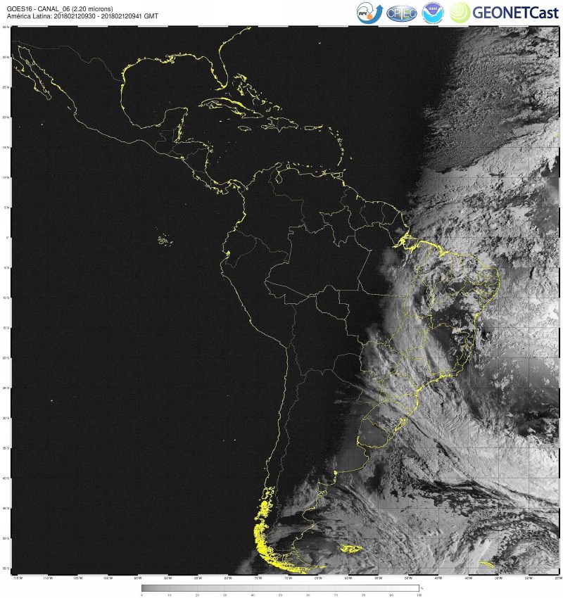 Imagem do satélite GOES 16/NOAA/EUA – Canal do Infravermelho (6) – dia 12/02/2018 – Hora local: 07:30 – América do Sul. Fonte: Instituto Nacional de Pesquisas Espaciais (INPE)/Centro de Previsão de Tempo e Estudos Climáticos (CPTEC)/Divisão de Satélites e Sistemas Ambientais (DSA)/GEONETCast modificado por LabClima/UNIVALI.