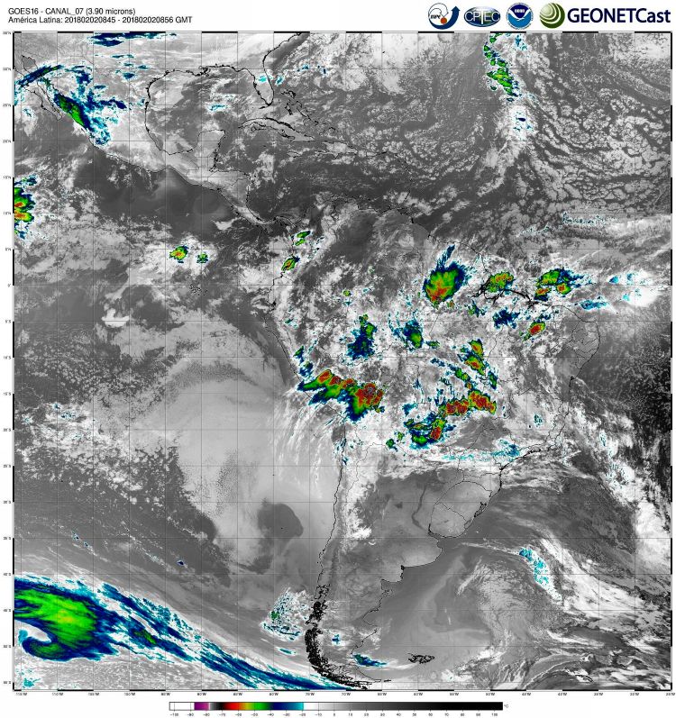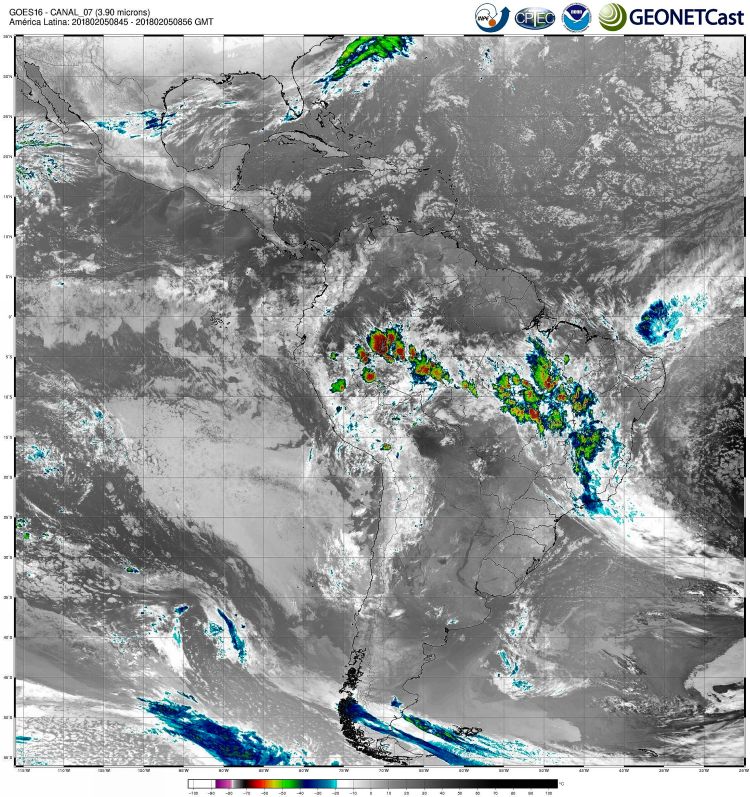 Imagem do satélite GOES 16/NOAA/EUA – Canal do Infravermelho (7) – dia 05/02/2018 – Hora local: 06:45 – América do Sul. Fonte: Instituto Nacional de Pesquisas Espaciais (INPE)/Centro de Previsão de Tempo e Estudos Climáticos (CPTEC)/Divisão de Satélites e Sistemas Ambientais (DSA)/GEONETCast modificado por LabClima/UNIVALI.