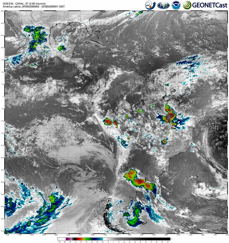 Imagem do satélite GOES 16/NOAA/EUA – Canal do Infravermelho (7) – dia 09/02/2018 – Hora local: 07:00 – América do Sul. Fonte: Instituto Nacional de Pesquisas Espaciais (INPE)/Centro de Previsão de Tempo e Estudos Climáticos (CPTEC)/Divisão de Satélites e Sistemas Ambientais (DSA)/GEONETCast modificado por LabClima/UNIVALI.
