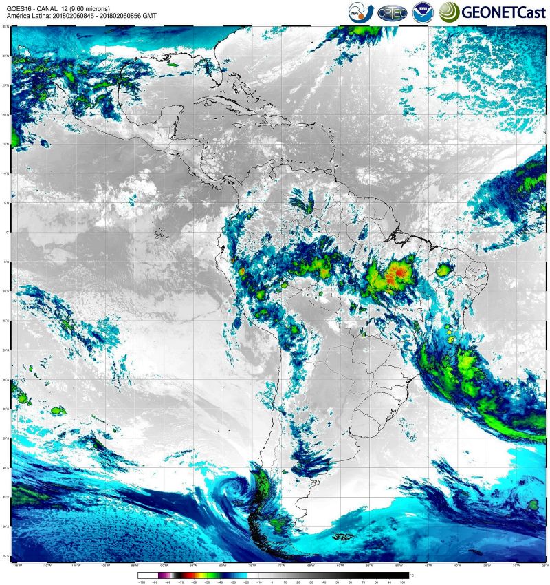 Imagem do satélite GOES 16/NOAA/EUA – Canal do Infravermelho (12) – dia 06/02/2018 – Hora local: 06:45 – América do Sul. Fonte: Instituto Nacional de Pesquisas Espaciais (INPE)/Centro de Previsão de Tempo e Estudos Climáticos (CPTEC)/Divisão de Satélites e Sistemas Ambientais (DSA)/GEONETCast modificado por LabClima/UNIVALI.