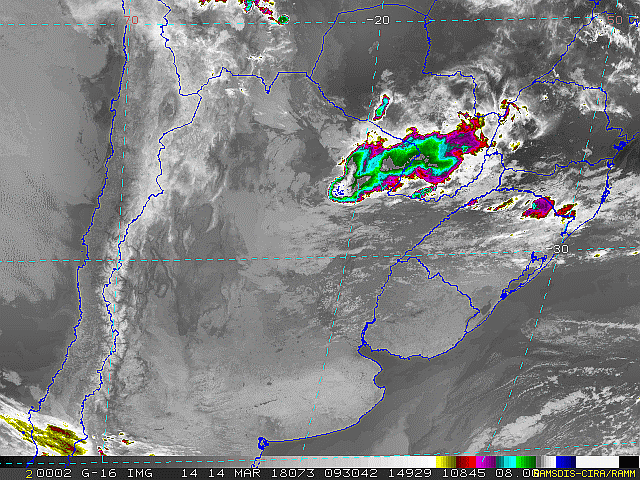 Imagem do satélite GOES 16/NOAA/EUA – Canal do Infravermelho + realce – dia – 14/03/2018 – Hora local: 06:30 – Sul do Brasil. Fonte: RAMSDIS Online – Central and South America and the Caribbean, Cooperative Institute for Research in the Atmosphere, Colorado State University, EUA, modificado por LabClima/UNIVALI.
