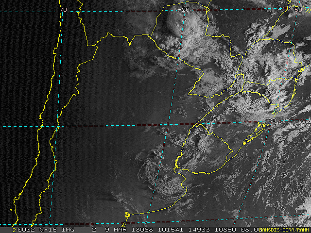 Imagem do satélite GOES 16/NOAA/EUA – Canal do Visível – dia 09/03/2018 – Hora local: 07:15 – Sul do Brasil. Fonte: RAMSDIS Online – Central and South America and the Caribbean, Cooperative Institute for Research in the Atmospere, Colorado State University, EUA, modificado por LabClima/UNIVALI.