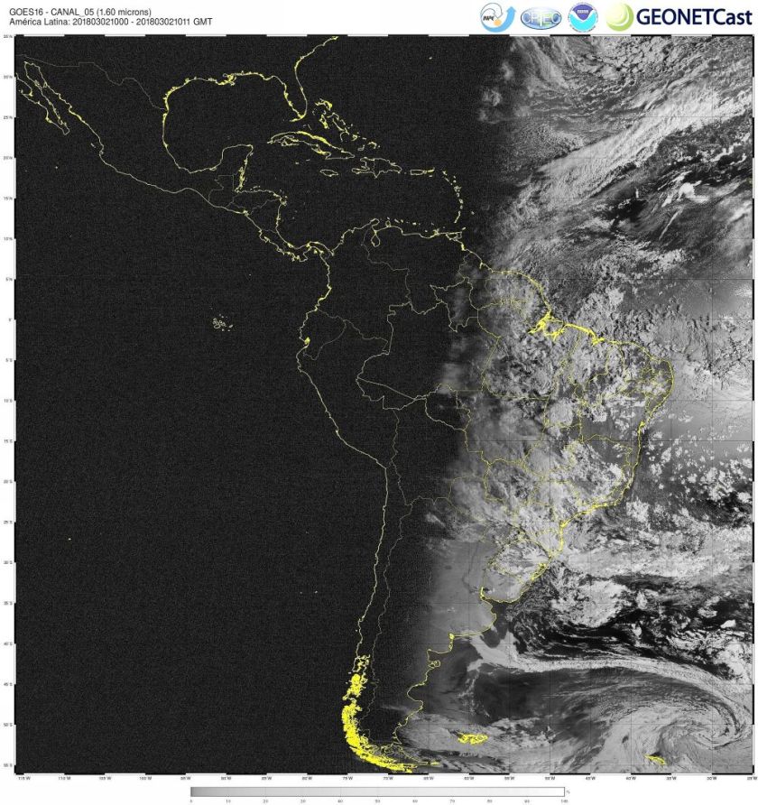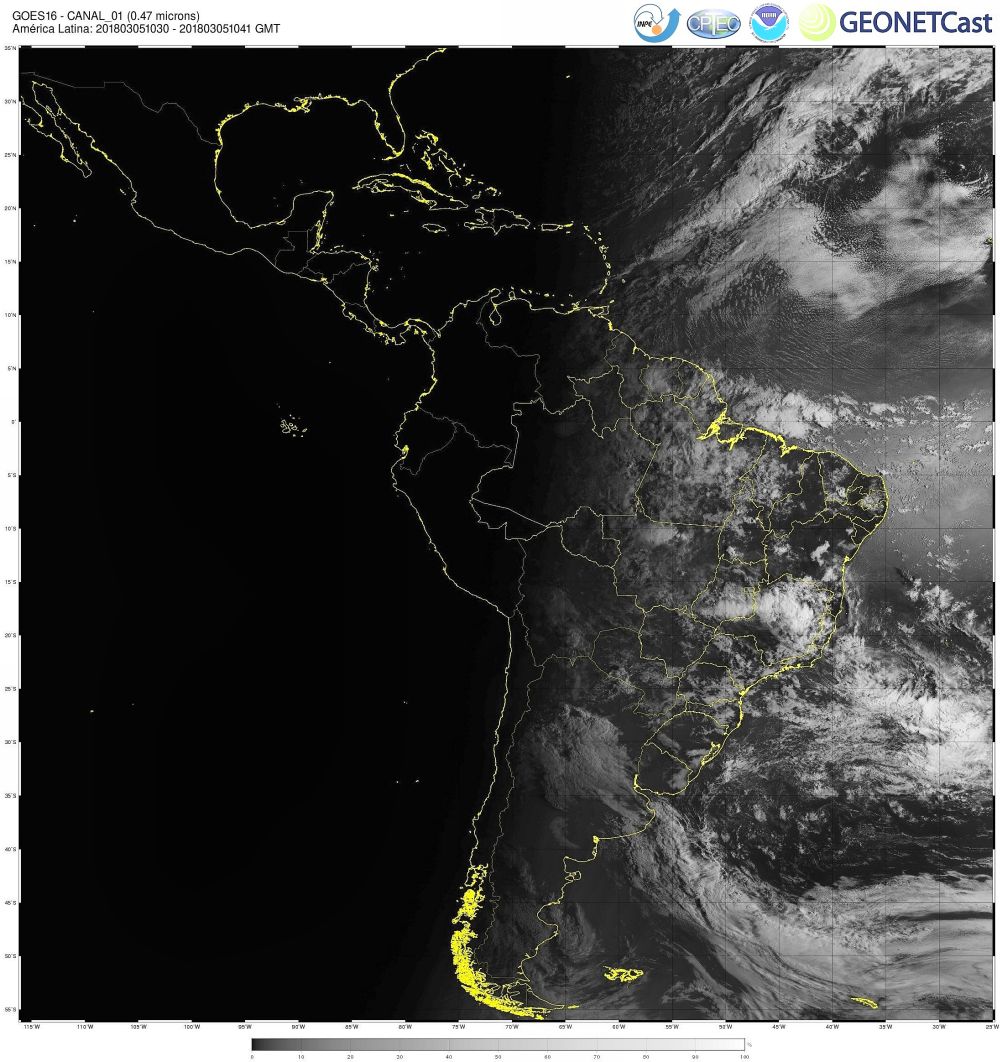 Imagem do satélite GOES 16/NOAA/EUA – Canal do visível (1) – dia 05/03/2018 – Hora local: 07:30 – América do Sul. Fonte: Instituto Nacional de Pesquisas Espaciais (INPE)/Centro de Previsão de Tempo e Estudos Climáticos (CPTEC)/Divisão de Satélites e Sistemas Ambientais (DSA)/GEONETCast modificado por LabClima/UNIVALI.