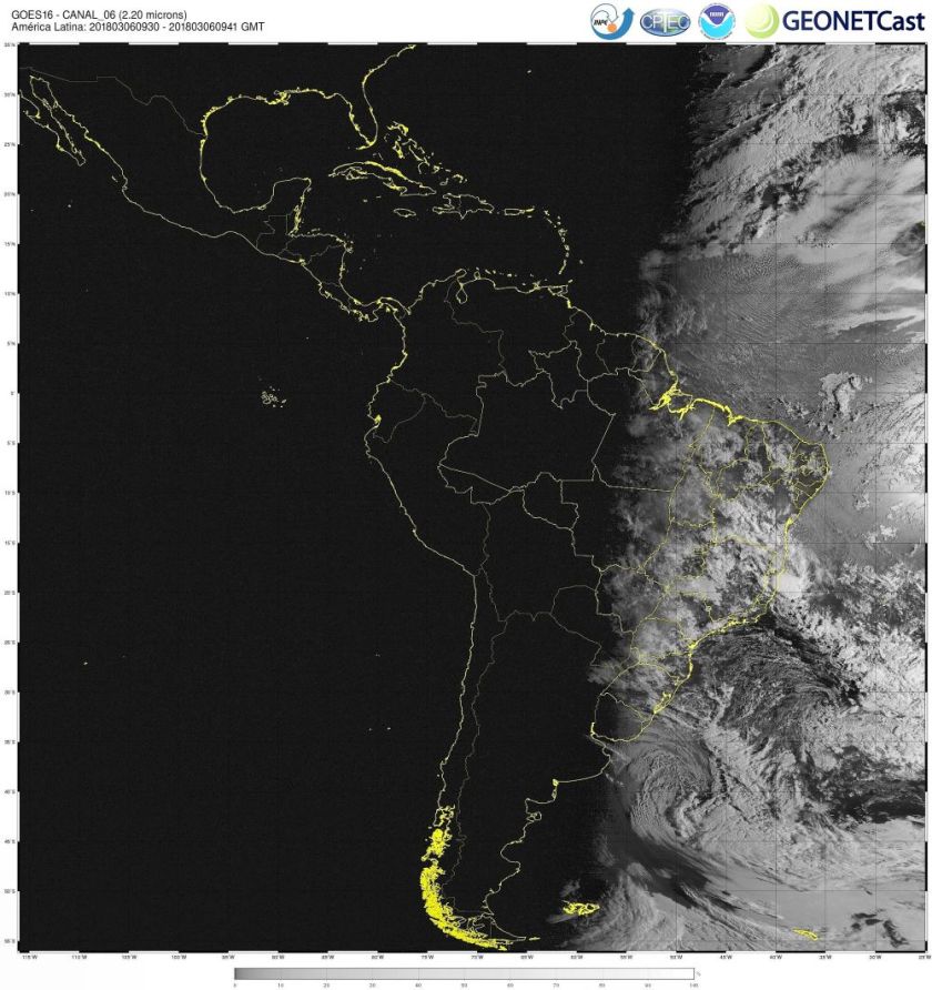 Imagem do satélite GOES 16/NOAA/EUA – Canal do Infravermelho (6) – dia 06/03/2018 – Hora local: 06:30 – América do Sul. Fonte: Instituto Nacional de Pesquisas Espaciais (INPE)/Centro de Previsão de Tempo e Estudos Climáticos (CPTEC)/Divisão de Satélites e Sistemas Ambientais (DSA)/GEONETCast modificado por LabClima/UNIVALI. (Clique para ampliar).