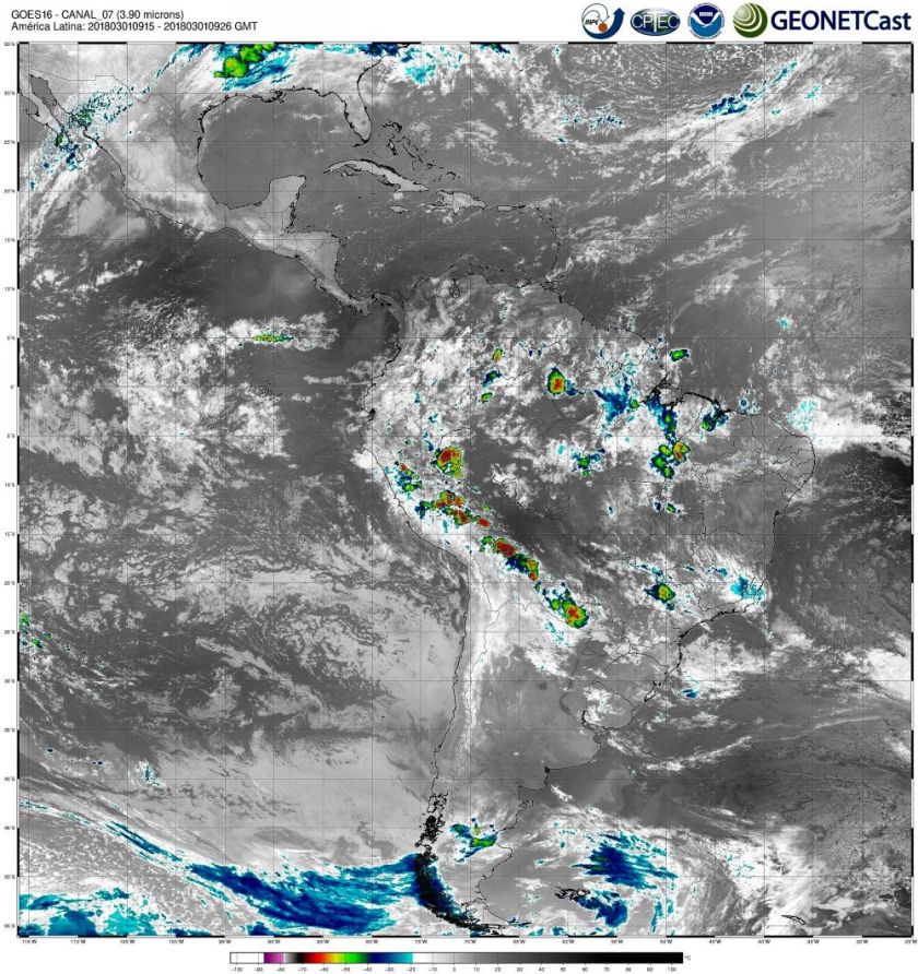 Imagem do satélite GOES 16/NOAA/EUA – Canal do Infravermelho (7) – dia 01/03/2018 – Hora local: 06:15 – América do Sul. Fonte: Instituto Nacional de Pesquisas Espaciais (INPE)/Centro de Previsão de Tempo e Estudos Climáticos (CPTEC)/Divisão de Satélites e Sistemas Ambientais (DSA)/GEONETCast modificado por LabClima/UNIVALI. (Clique para ampliar).