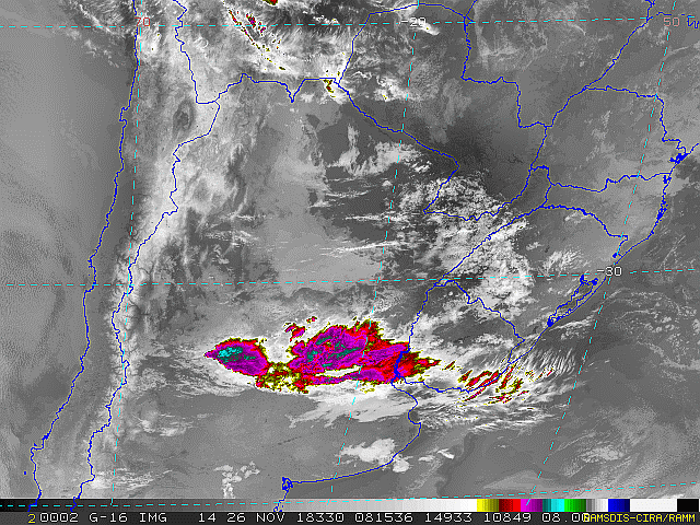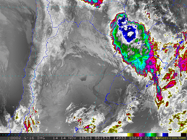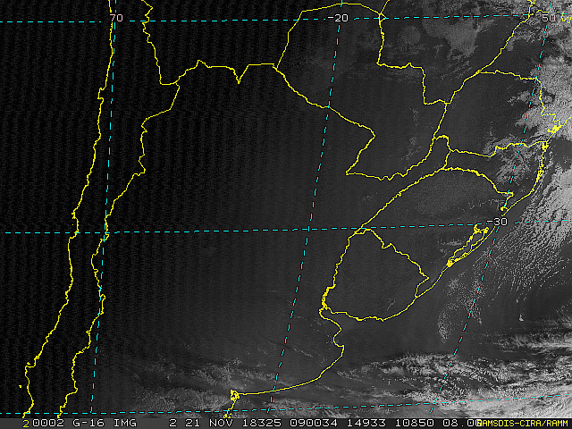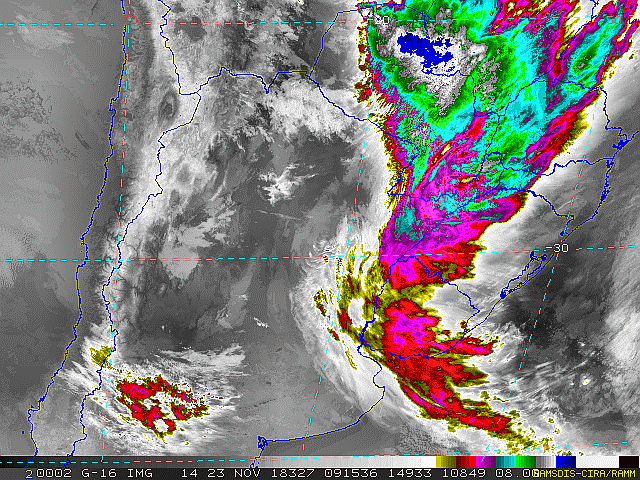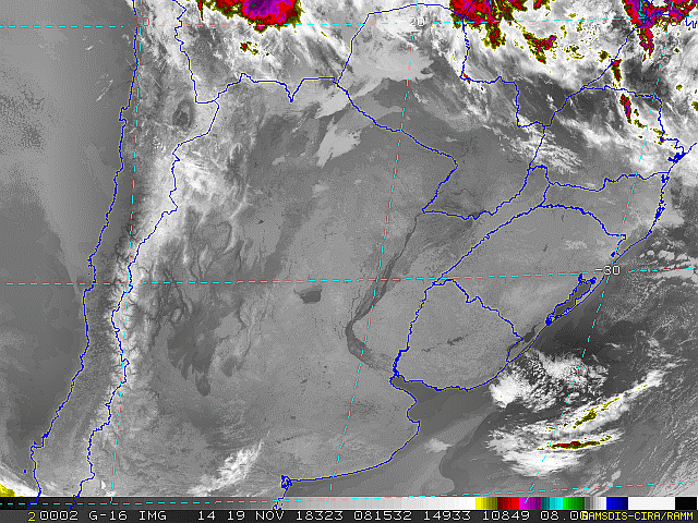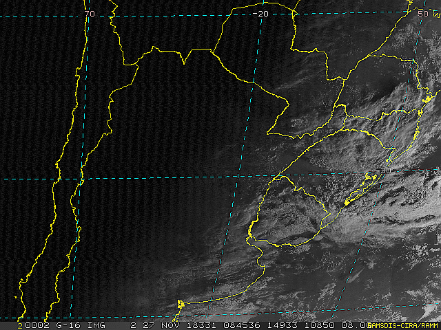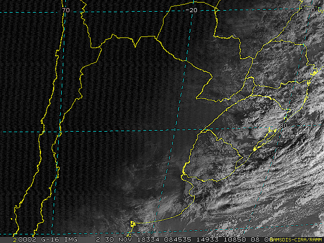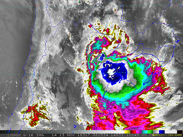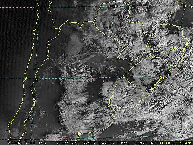 Observe a imagem de satélite desse início de manhã nebulosidade presente em toda a região sul. Essa condição se deve a áreas de instabilidade que atuam sobre a região. No decorrer dessa sexta-feira e sábado essas áreas se deslocarão em direção ao oceano, se intensificarão e formarão uma nova frente fria.