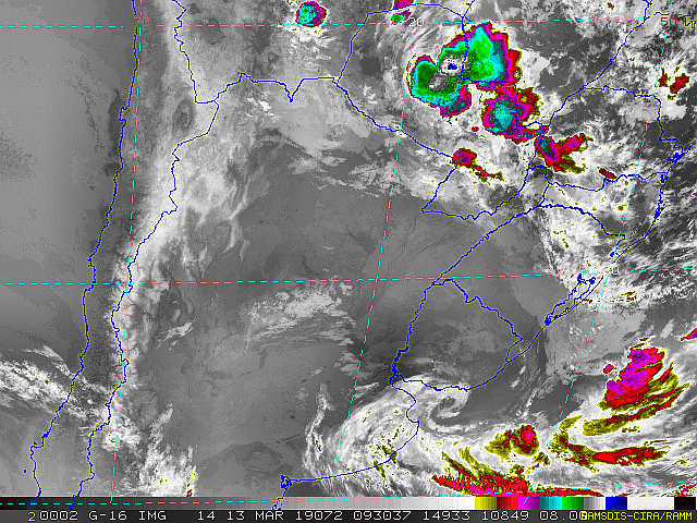 Imagem do satélite GOES 16/NOAA/EUA – Canal do Infravermelho + realce – dia – 13/03/2019 – Hora local: 06:30 – Sul do Brasil. Fonte: RAMSDIS Online – Central and South America and the Caribbean, Cooperative Institute for Research in the Atmosphere, Colorado State University, EUA, modificado por LabClima/UNIVALI.