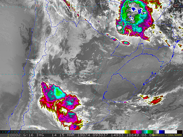 Imagem do satélite GOES 16/NOAA/EUA – Canal do Infravermelho + realce – dia – 15/03/2019 – Hora local: 06:30 – Sul do Brasil. Fonte: RAMSDIS Online – Central and South America and the Caribbean, Cooperative Institute for Research in the Atmosphere, Colorado State University, EUA, modificado por LabClima/UNIVALI.