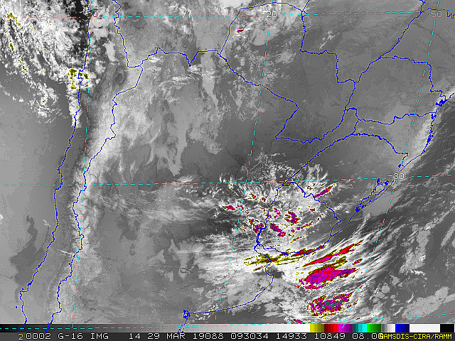 Imagem do satélite GOES 16/NOAA/EUA – Canal do Infravermelho + realce – dia – 29/03/2019 – Hora local: 06:30 – Sul do Brasil. Fonte: RAMSDIS Online – Central and South America and the Caribbean, Cooperative Institute for Research in the Atmosphere, Colorado State University, EUA, modificado por LabClima/UNIVALI.
