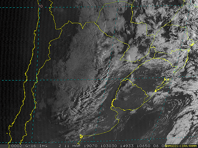 Imagem do satélite GOES 16/NOAA/EUA – Canal do Visível – dia 11/03/2019 – Hora local: 07:30 – Sul do Brasil. Fonte: RAMSDIS Online – Central and South America and the Caribbean, Cooperative Institute for Research in the Atmosphere, Colorado State University, EUA, modificado por LabClima/UNIVALI.