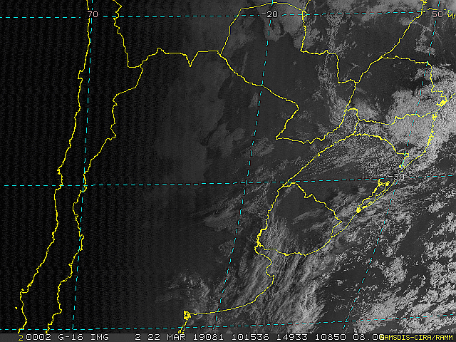 Imagem do satélite GOES 16/NOAA/EUA – Canal do Visível – dia 22/03/2019 – Hora local: 07:15 – Sul do Brasil. Fonte: RAMSDIS Online – Central and South America and the Caribbean, Cooperative Institute for Research in the Atmosphere, Colorado State University, EUA, modificado por LabClima/UNIVALI.
