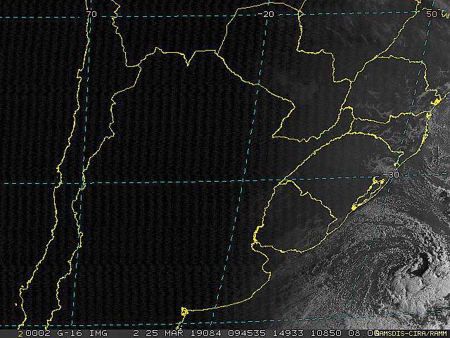 Imagem do satélite GOES 16/NOAA/EUA – Canal do Infravermelho + realce – dia – 27/03/2019 – Hora local: 06:30 – Sul do Brasil. Fonte: RAMSDIS Online – Central and South America and the Caribbean, Cooperative Institute for Research in the Atmosphere, Colorado State University, EUA, modificado por LabClima/UNIVALI.