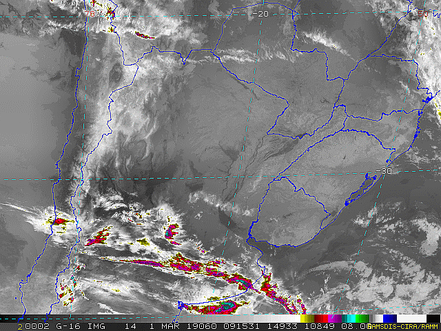 Hoje temos um cavado (corredor de umidade) atuando sobre a região sudeste. Amanhã uma nova frente fria se deslocará pelo Rio Grande do Sul, passando pela nossa região no domingo. Na próxima terça-feira novas áreas de instabilidade chegarão ao estado. Dessa forma para o fim de semana e o carnaval teremos bons períodos de sol, calor e chuva rápida e isolada por causa do aquecimento. Observe a imagem de satélite desse início de manhã nebulosidade esparsa no estado.