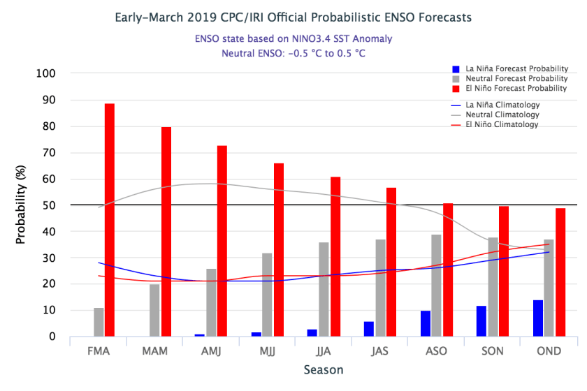 O outono desse ano estará sob a influência de um El Niño fraco. Observe a figura 1 abaixo que o mesmo permanecerá até julho com 50% de chance de ocorrência.