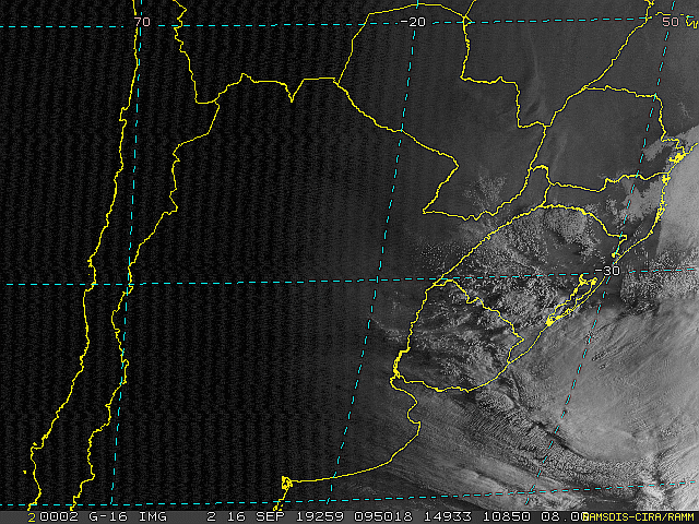 Imagem do satélite GOES 16/NOAA/EUA – Canal do Visível – dia 16/09/2019 – Hora local: 06:50 – Sul do Brasil. Fonte: RAMSDIS Online – Central and South America and the Caribbean, Cooperative Institute for Research in the Atmospere, Colorado State University, EUA, modificado por LabClima/UNIVALI.