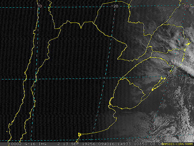 Imagem do satélite GOES 16/NOAA/EUA – Canal do Visível – dia 13/09/2019 – Hora local: 06:40 – Sul do Brasil. Fonte: RAMSDIS Online – Central and South America and the Caribbean, Cooperative Institute for Research in the Atmospere, Colorado State University, EUA, modificado por LabClima/UNIVALI.