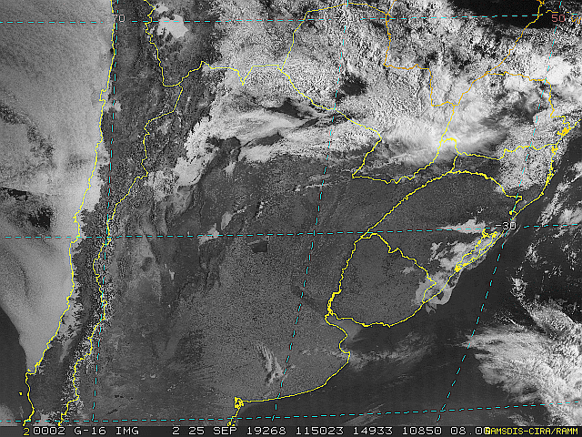 Imagem do satélite GOES 16/NOAA/EUA – Canal do Visível – dia 25/09/2019 – Hora local: 08:50 – Sul do Brasil. Fonte: RAMSDIS Online – Central and South America and the Caribbean, Cooperative Institute for Research in the Atmospere, Colorado State University, EUA, modificado por LabClima/UNIVALI.