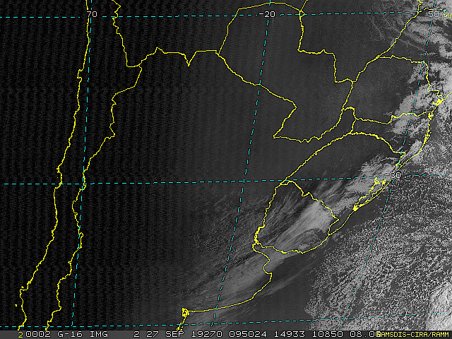 Imagem do satélite GOES 16/NOAA/EUA – Canal do Visível – dia 27/09/2019 – Hora local: 06:50 – Sul do Brasil. Fonte: RAMSDIS Online – Central and South America and the Caribbean, Cooperative Institute for Research in the Atmospere, Colorado State University, EUA, modificado por LabClima/UNIVALI.