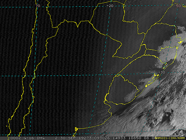Imagem do satélite GOES 16/NOAA/EUA – Canal do Visível – dia 30/09/2019 – Hora local: 06:30 – Sul do Brasil. Fonte: RAMSDIS Online – Central and South America and the Caribbean, Cooperative Institute for Research in the Atmospere, Colorado State University, EUA, modificado por LabClima/UNIVALI.