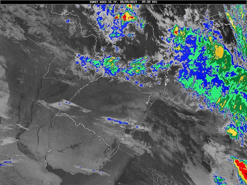 Imagem do satélite GOES 16/NOAA/EUA – Canal do Infravermelho + realce – dia -20/09/2019 – Hora local: 06:20 – Sul do Brasil. Fonte: Instituto Nacional de Meteorologia (INMET) modificado por LabClima/UNIVALI.