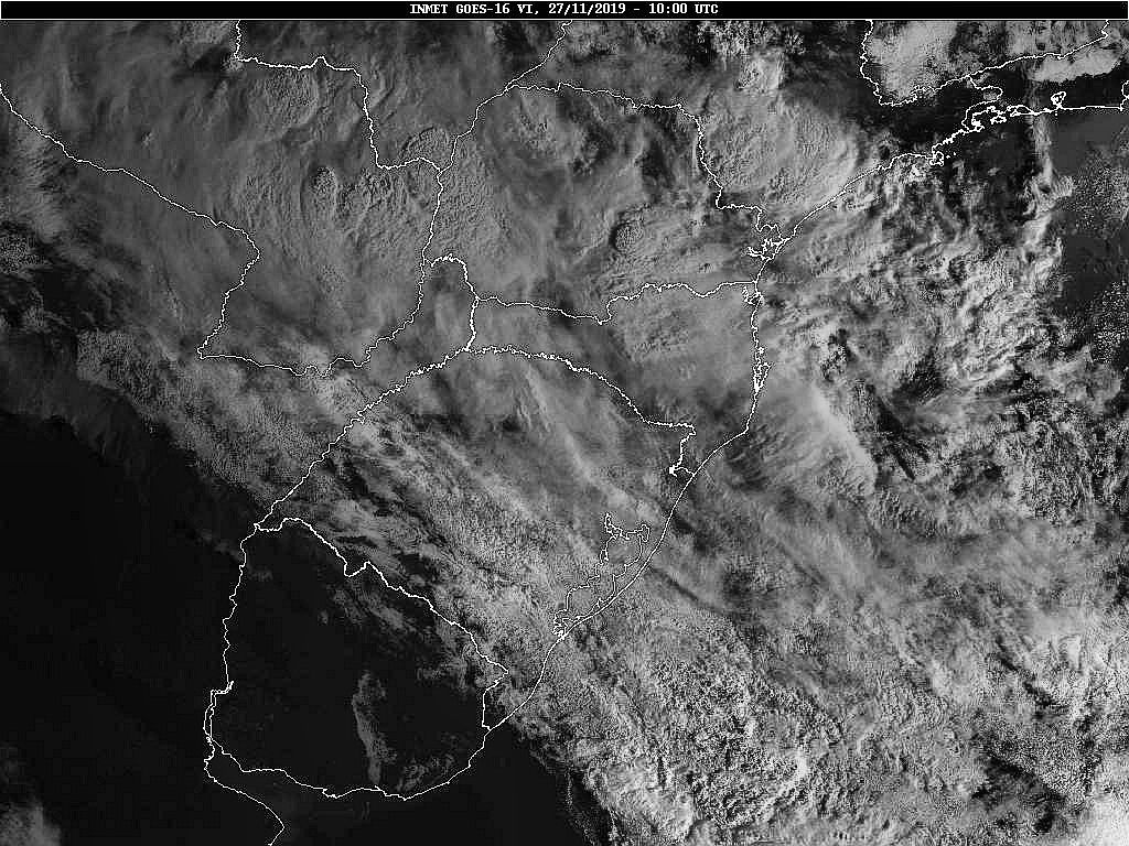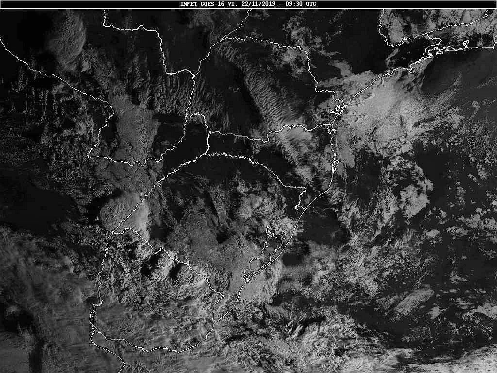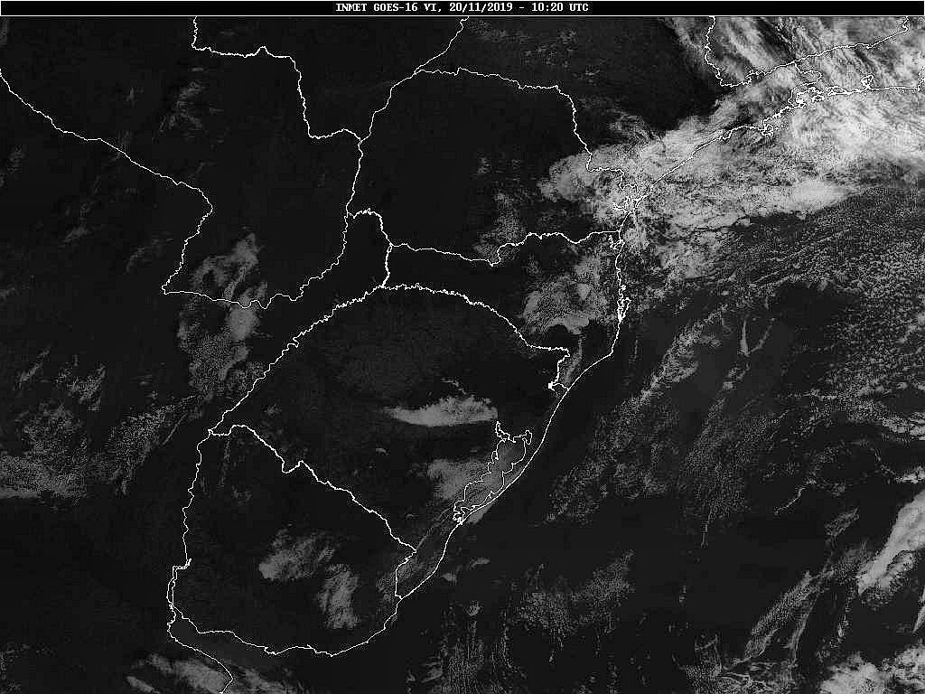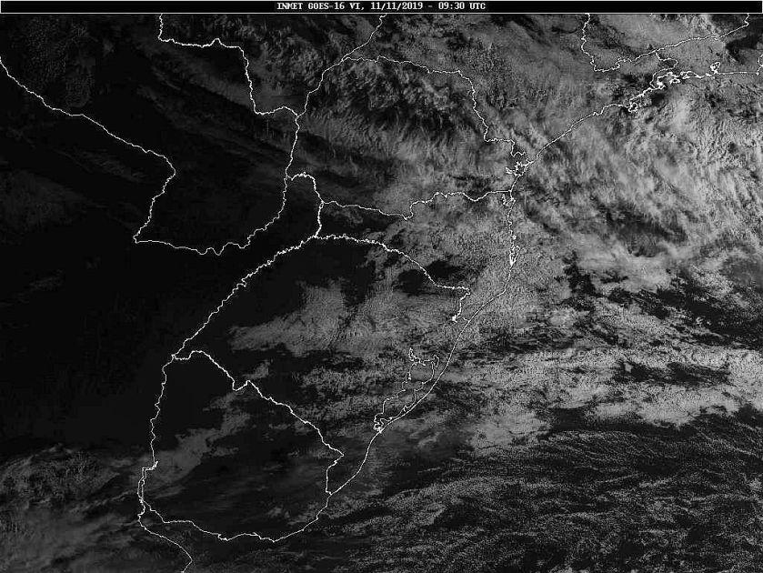 Hoje fez frio no estado e em nossa região. Em Bom Jardim da Serra fez 5,5°C. Aqui fez 13,9°C em Camboriú e 14,6°C em Itajaí. Isso se deve a presença de uma massa de ar polar que deixará o tempo estável no fim de semana. No domingo teremos pancadas de chuva à noite pela passagem de uma frente fria e pelo calor. Observe a imagem de satélite desse início de manhã poucas nuvens sobre Santa Catarina.